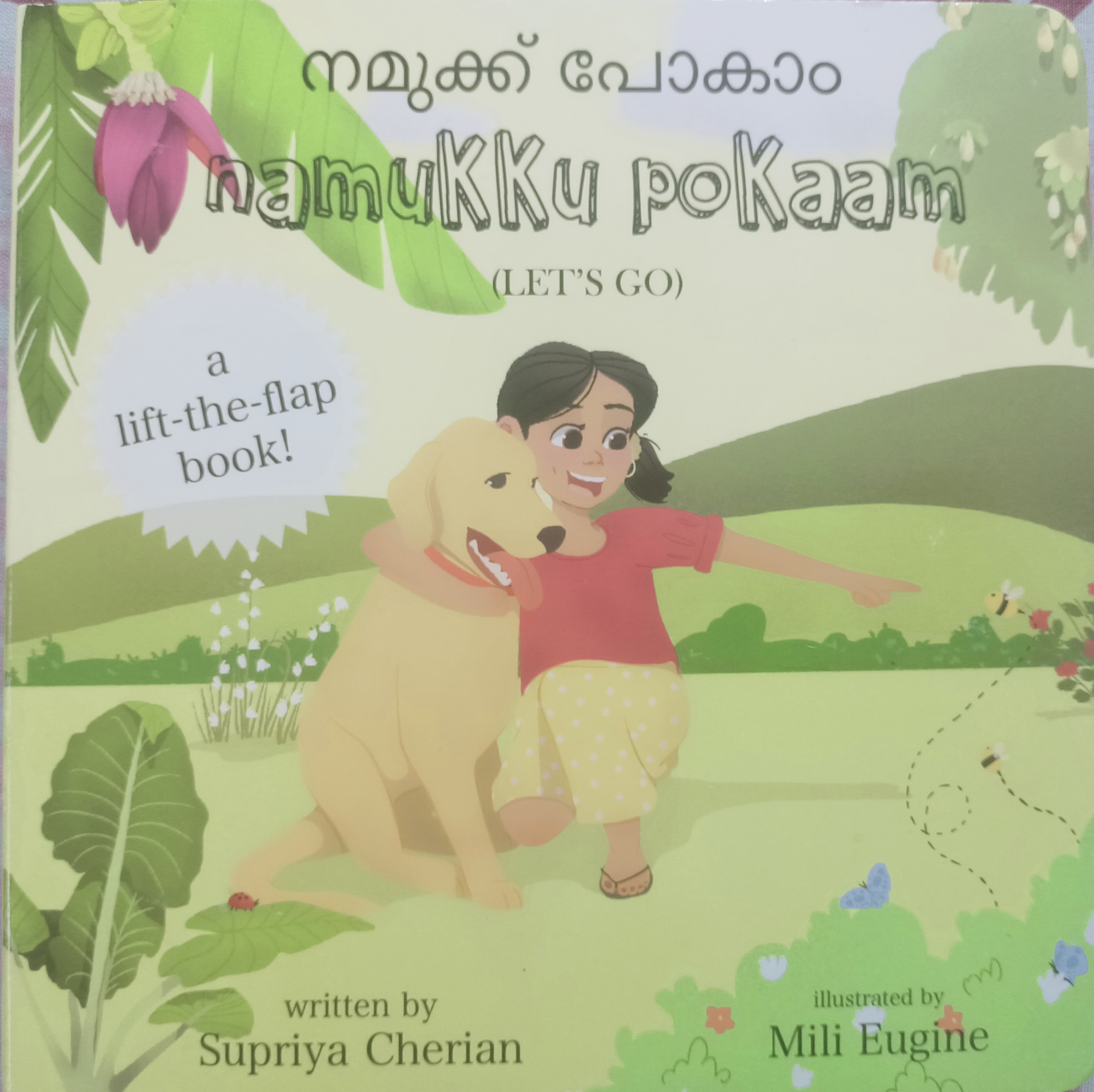 “Namukku Pokaam,” written by Supriya Cherian and illustrated by Mili Eugine, tells us a charming story of Rosy, a young girl, and Rocky, her dog, as they journey through some common backdrops of Kerala. Together, they explore everything from mango trees to oru vazhathoppu (a banana farm). Rosy, her hair adorned with mullappu (jasmine flowers) and in her cheripukkal (slippers), runs with Rocky through a hill station, and then they chase poombatta (butterflies) through a field. Finally, ending their day with a ball game and feeling the breeze on the oonjaal (swing), Rosy and Rocky go to bed and sleep under the starry sky.